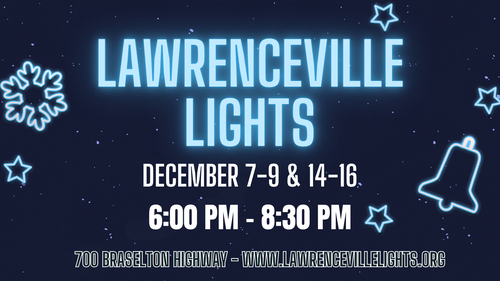 Lawrenceville Lights will be open December 7-9 and 14-16 from 6:00 PM to 8:30 PM at the LVfirst Campground (700 Braselton Hwy, Lawrenceville, GA). You can find more information and register to volunteer at www.lawrencevillelights.org
