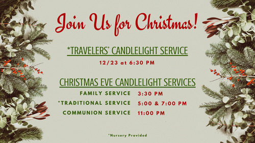 We will have our Travelers' Christmas Eve service on December 23rd in the Family Center at 6:30PM. This is an opportunity for those who are traveling to worship with their church family before heading out of town for Christmas. This service is led by our modern worship band and includes contemporary Christmas music and hymns.
