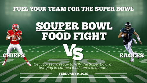 The big game is coming up next weekend! As in previous years, we'll have our own SOUPer Bowl challenge on Sunday morning. Bring canned food items and place them in the box of the team you think will win the Super Bowl later that evening! Show your team spirit and help us feed families in our community at the same time!
