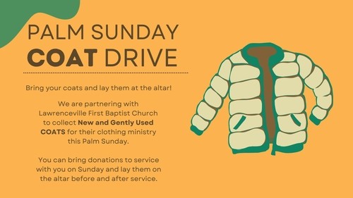 In the story of Jesus' entry into Jerusalem, the people were so excited to see Jesus that they laid their coats out along the road to welcome Him. In a similar way, each Palm Sunday we hold a coat collection to help the Lawrenceville First Baptist Clothing Closet stock up on coats for the next winter. If you have a new or gently used coat that you'd be willing to donate, you can bring it with you to church on Palm Sunday and lay it at the altar.
