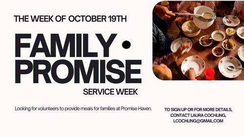 Our service week with Family Promise of Gwinnett is starting this Sunday! This is an opportunity to provide meals to families facing homelessness and staying at Family Promise's Promise Haven. Currently, we are in need of volunteers to provide dinner on Monday, Wednesday, Friday, and Saturday evenings.